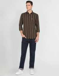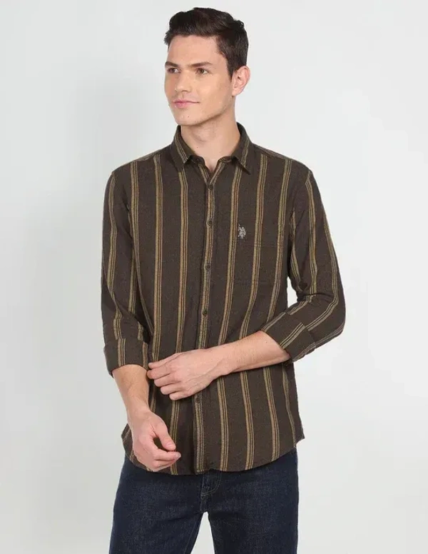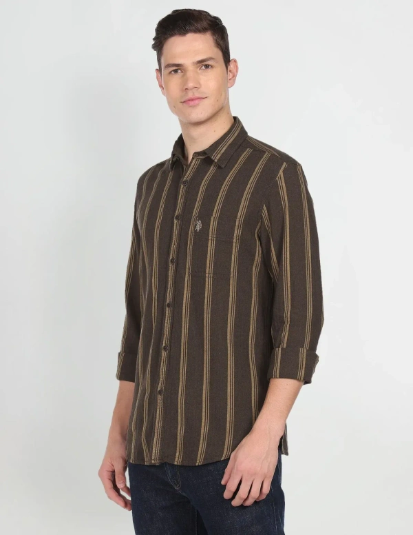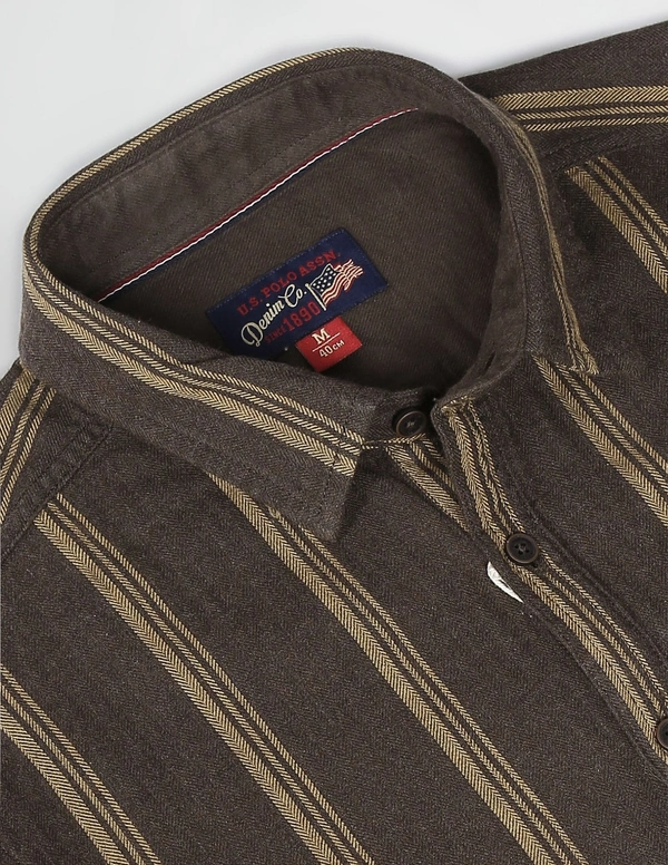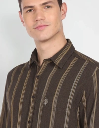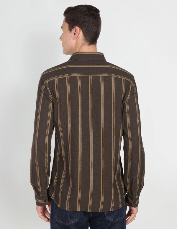 - Spread collar- Single chest patch pocket- Full button placket- Long sleeves with rounded cuffs- Curved hemline- Vertical stripe pattern- Twill weave- Summer Heroes